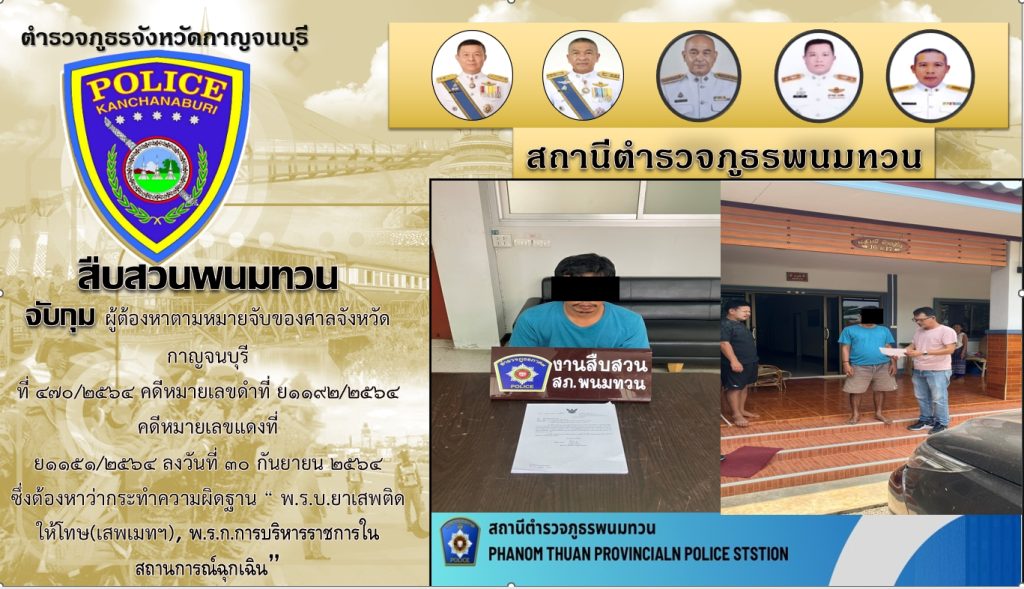 จับกุมผู้ต้องหาตามหมายจับของศาลจังหวัดกาญจนบุรี ที่ 470/2564 คดีหมายเลขดำที่ ย1192/2564 คดีหมายเลขแดงที่ ย1151/2564 ลงวันที่ 30 กันยายน 2564 ซึ่งต้องหาว่ากระทำความผิดฐาน “ พ.ร.บ.ยาเสพติดให้โทษ(เสพเมทฯ), พ.ร.ก.การบริหารราชการในสถานการณ์ฉุกเฉิน”