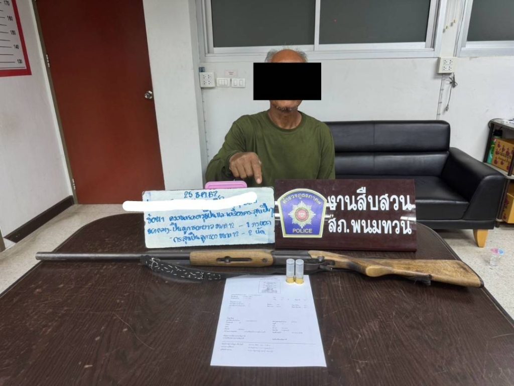 1.อาวุธปืนยาว(เดี่ยวลูกซอง) ขนาดเบอร์ 12 ไม่ปรากฏยี่ห้อ หมายเลขประจำปืน 9004732(อยู่ที่กะโหลกปืน) หมายเลขทะเบียนเลอะเลือน(อยู่ที่พานท้ายปืน) จำนวน 1 กระบอก