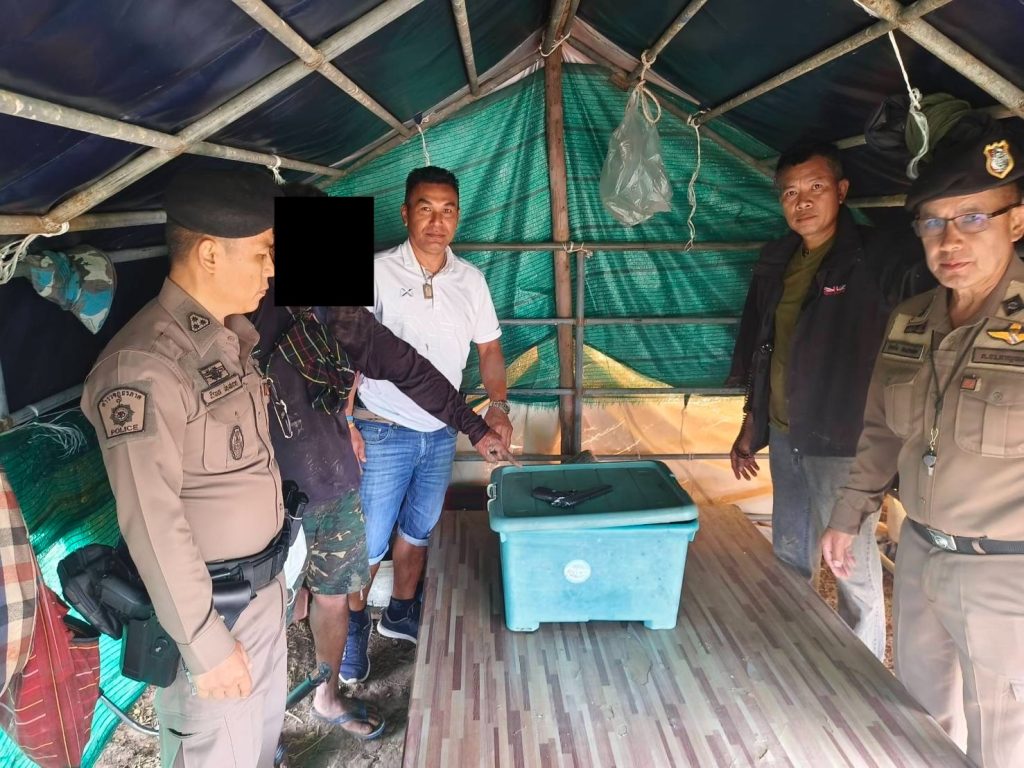 🔺ตำแหน่งที่พบของกลาง พบของกลางรายการที่ 1,2,3 วางอยู่บนกล่องพลาสติกสำหรับใส่ของใช้ สีเขียว อยู่บนแคร่ในเพิงพัก