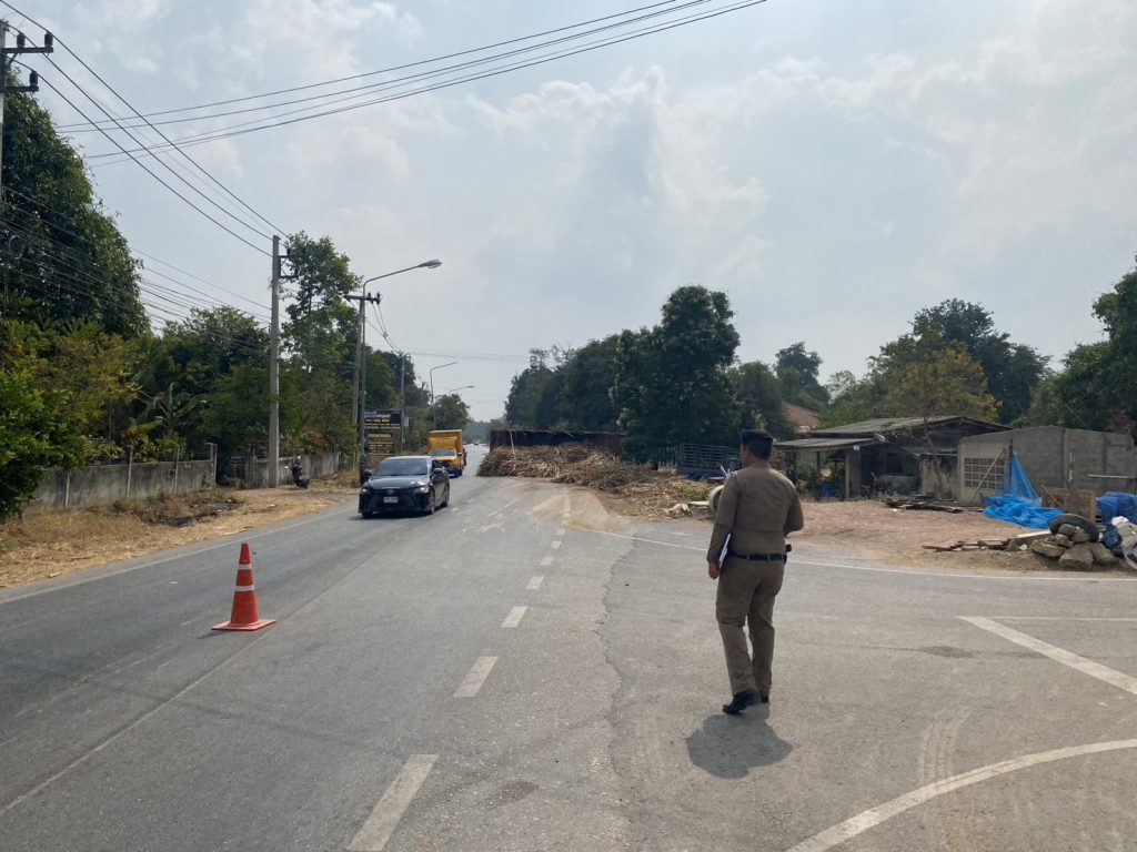 พนักงานสอบสวนตรวจสอบที่เกิดเหตุ รถบรรทุกพลิกคว่ำ