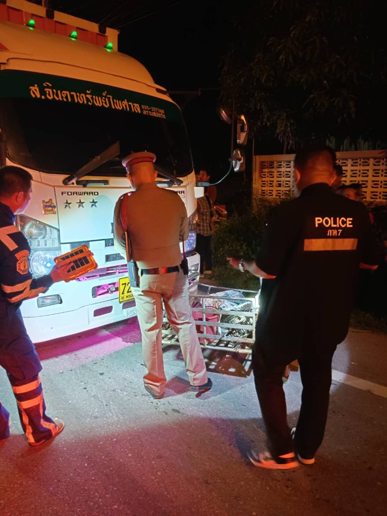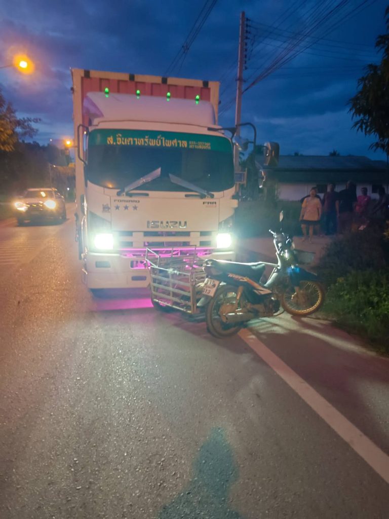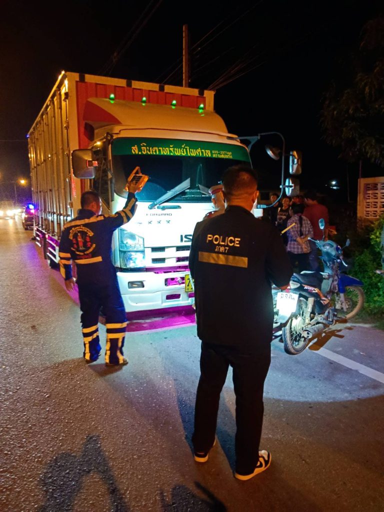 พนักงานสอบสวนตรวจสอบที่เกิดเหตุ รถยนต์บรรทุกหกล้อเฉี่ยวชนกับรถจักรยานยนต์พ่วงข้าง