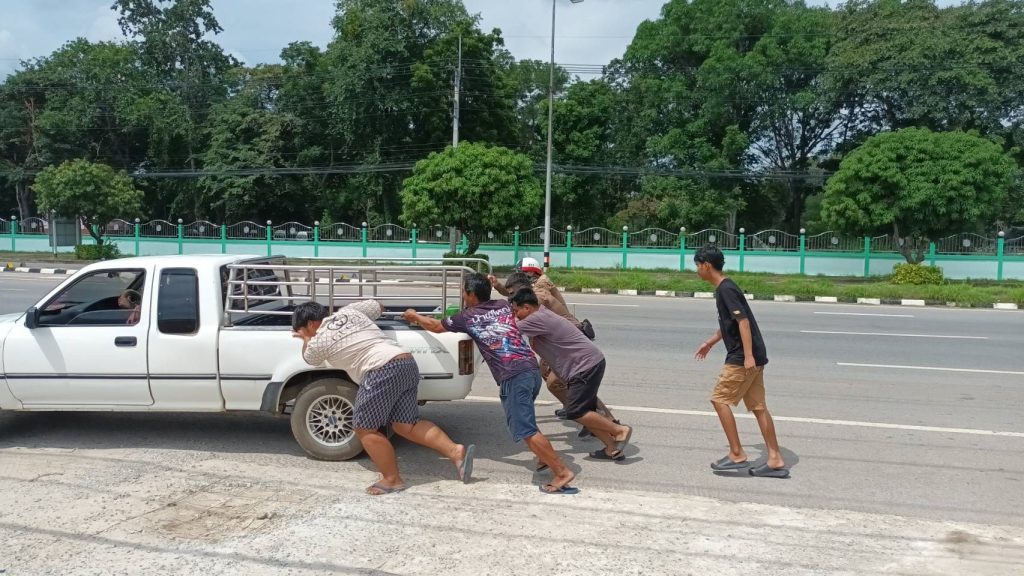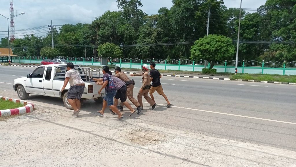 🔺 ให้การช่วยเหลือประชาชนรถแบตเตอรี่เสื่อม สายตรวจจราจรและพลเมืองดีได้ช่วยกันเข็นให้จนสตาร์ทติดและ สามารถเดินทางได้ต่อไป