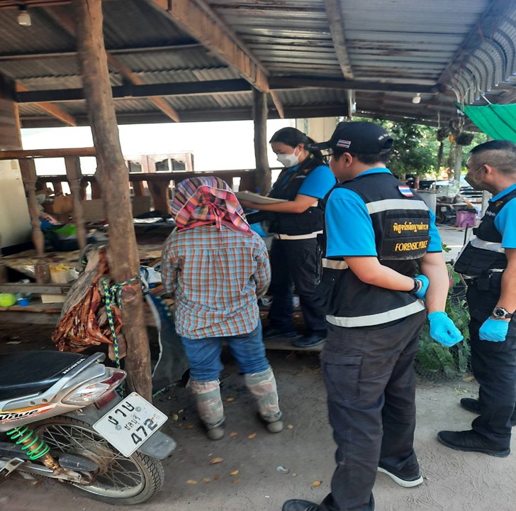 เจ้าหน้าที่พิสูจน์หลักฐานจังหวัดกาญจนบุรี ตรวจสถานที่เกิดเหตุเพลิงไหม้บ้าน สภ.พนมทวนวันที่ 25 ธ.ค.67