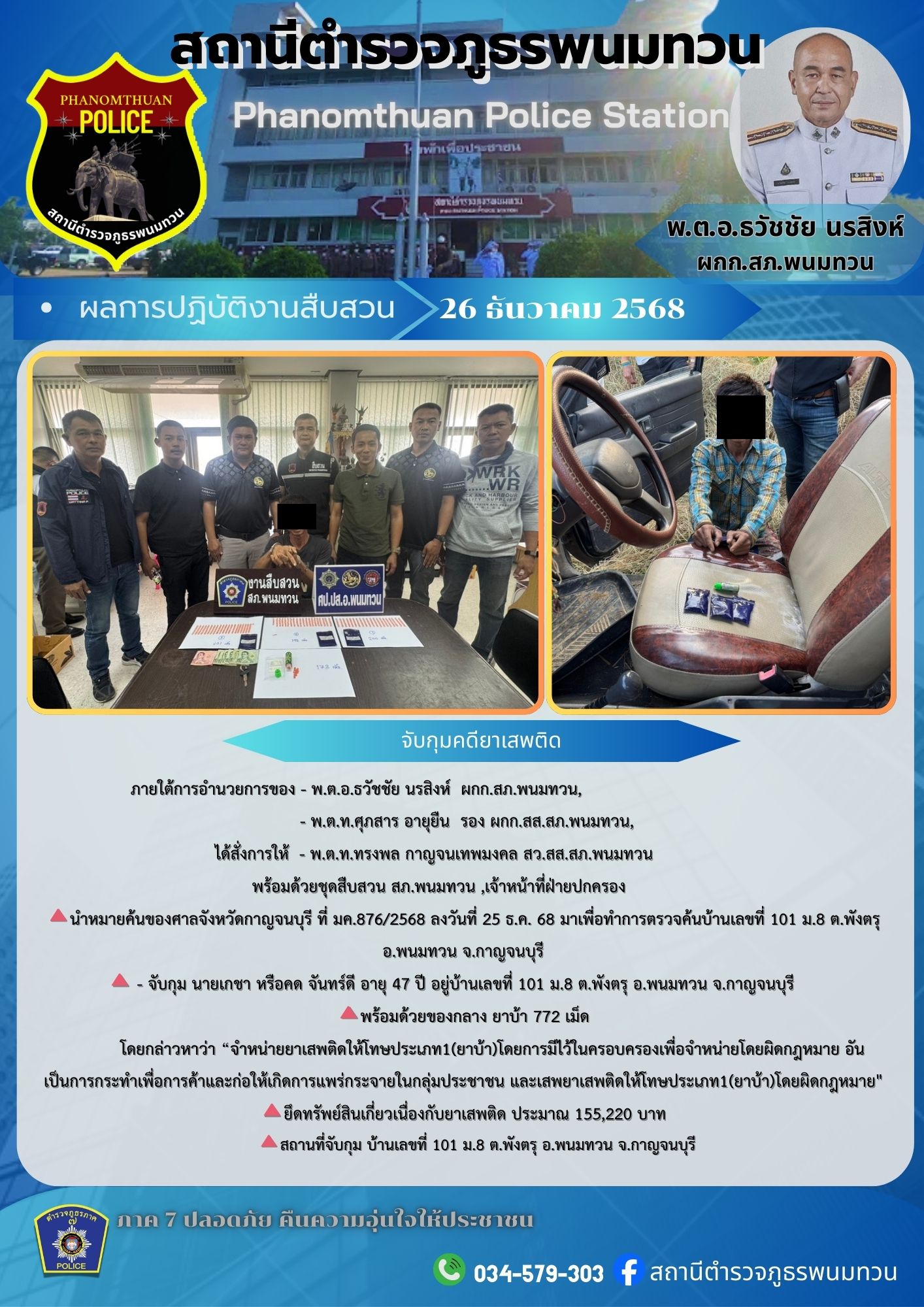 จับกุมผู้ต้องหาคดียาเสพติด 🔺สภ.พนมทวน ภ.จว.กาญจนบุรี รายงานผลการปฏิบัติจับกุมผู้ต้องหาคดียาเสพติด วั