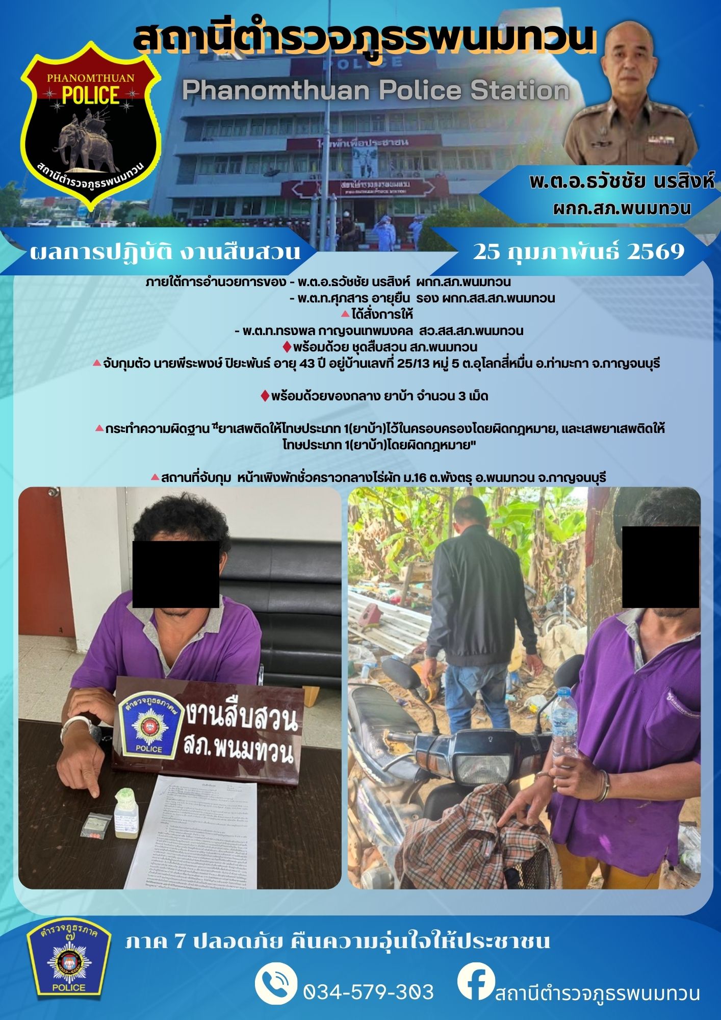ผลการปฏิบัติจับกุมผู้ต้องหาคดียาเสพติด 🔺สภ.พนมทวน ภ.จว.กาญจนบุรี 🔺ขอรายงานผลการปฏิบัติจับกุมผู้ต้องห