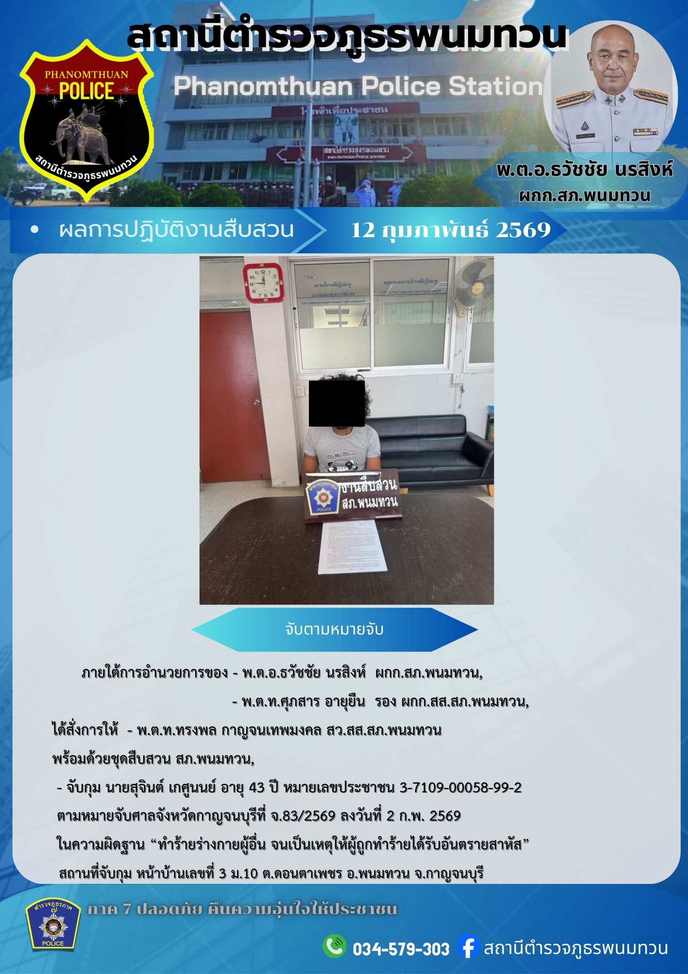 จับกุมตัวผู้ต้องหาตามหมายจับ 🔺สภ.พนมทวน ภ.จว.กาญจนบุรี ขอรายงานผลการปฏิบัติจับกุมผู้ต้องหาตามหมายจับ