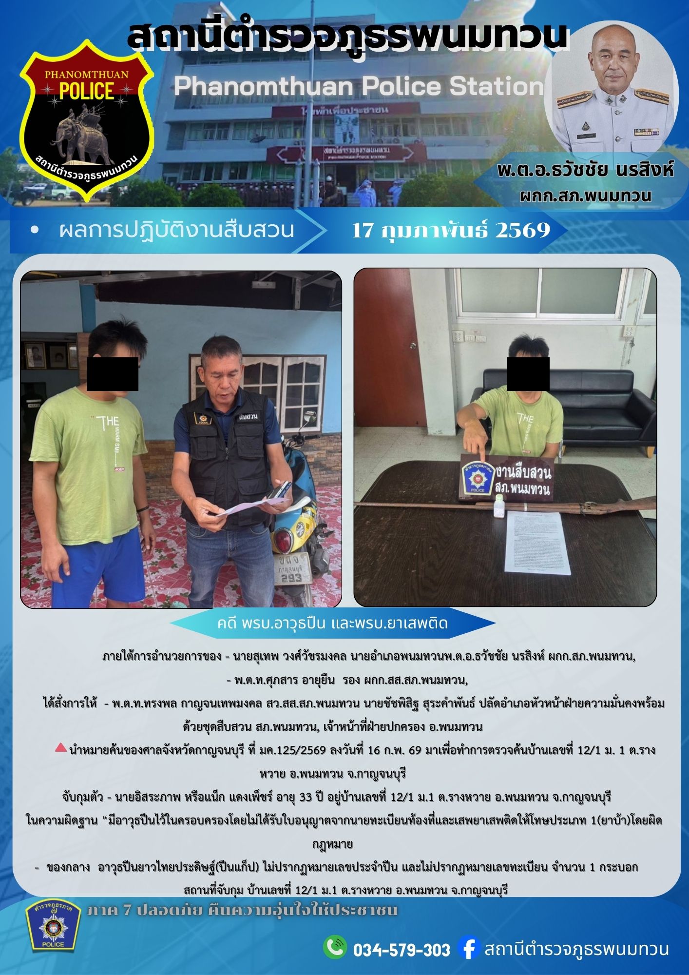 ผลการปฏิบัติจับกุมผู้ต้องหา พรบ.อาวุธปืน 🔺สภ.พนมทวน ภ.จว.กาญจนบุรี ขอรายงานผลการปฏิบัติจับกุมผู้ต้อง