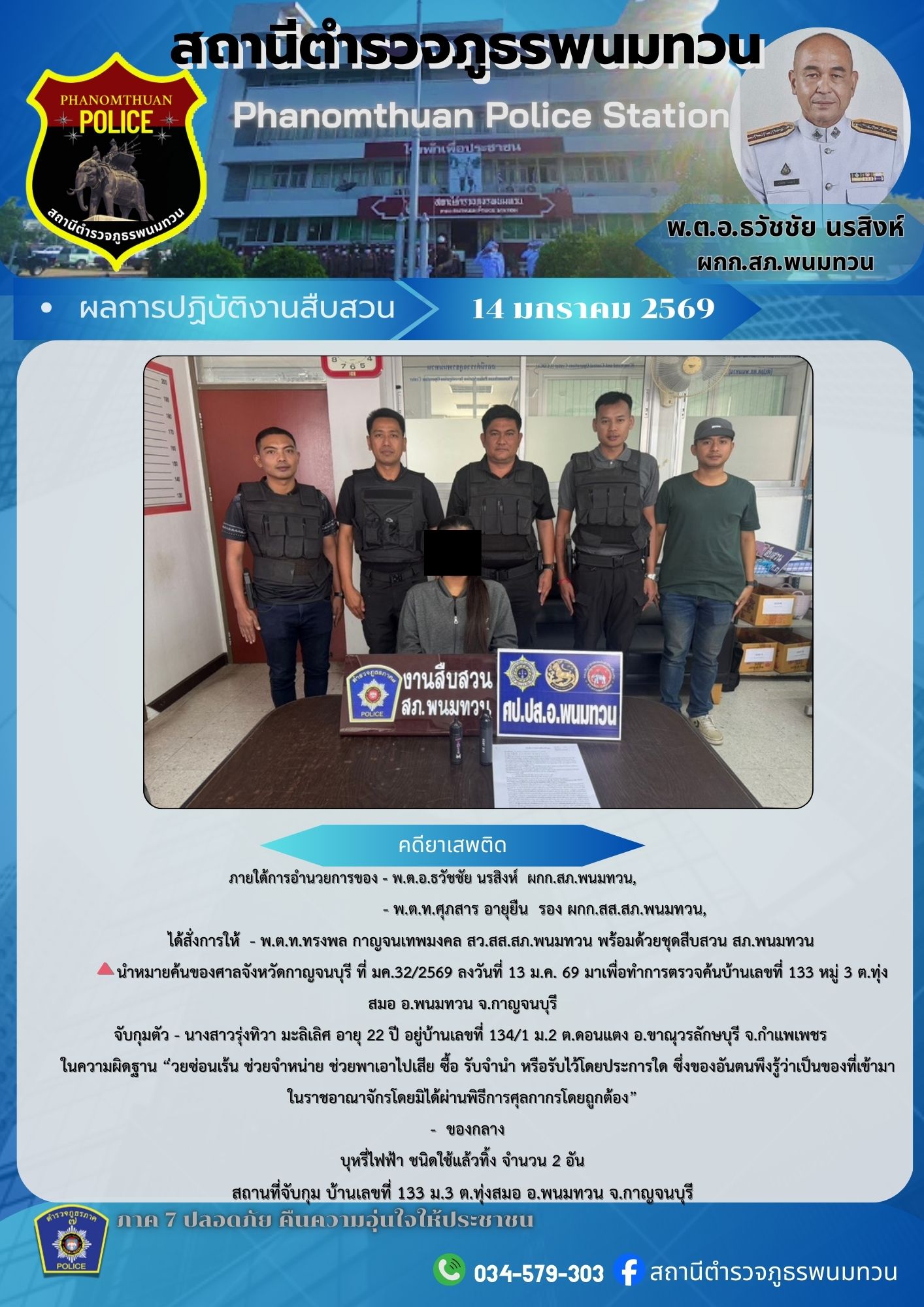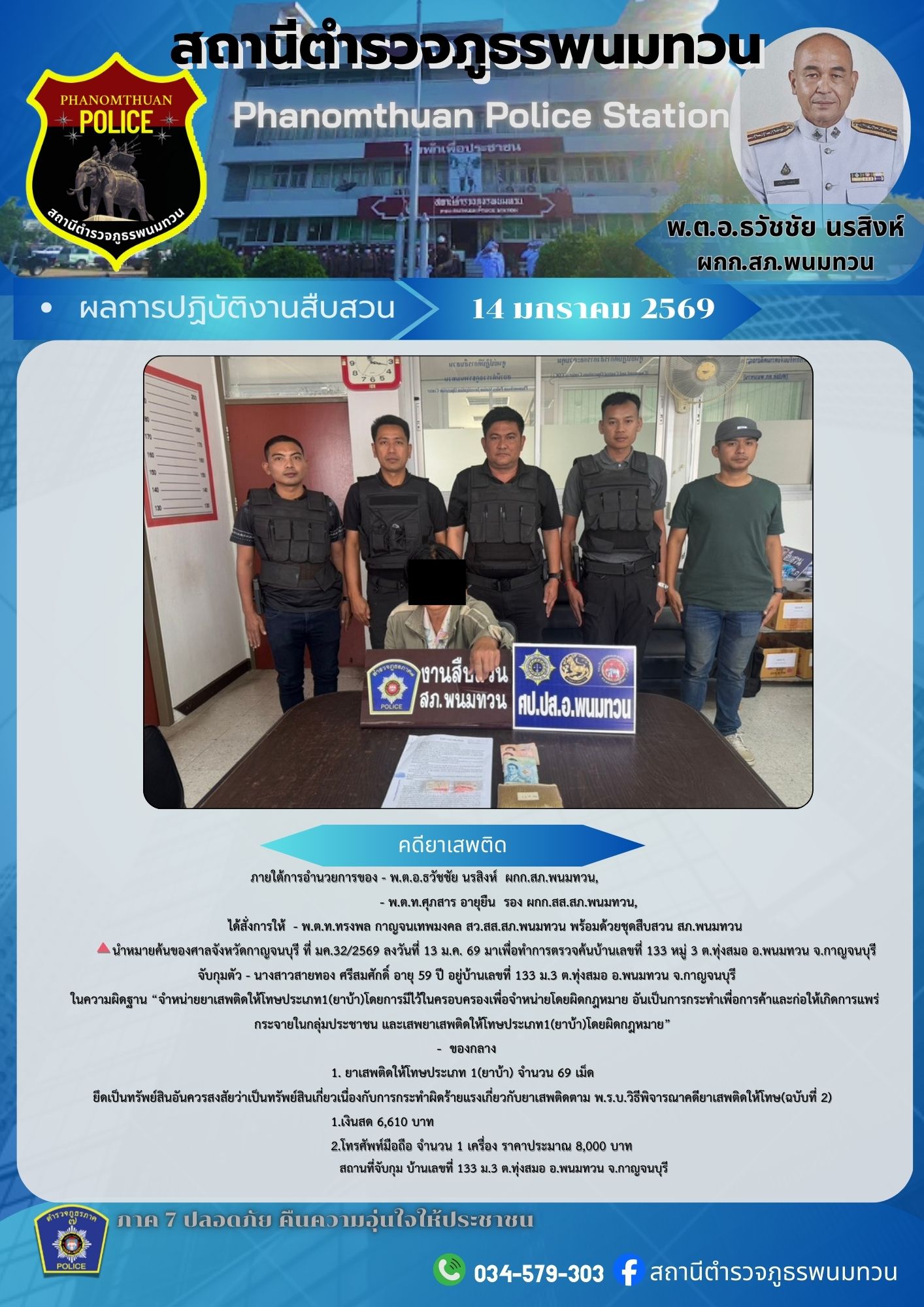 จับกุมผู้ต้องหา 🔺สภ.พนมทวน ภ.จว.กาญจนบุรี ผลการปฏิบัติจับกุมผู้ต้องหา🔺 วันที่ 14 มกราคม 2569 ♦️ภาย