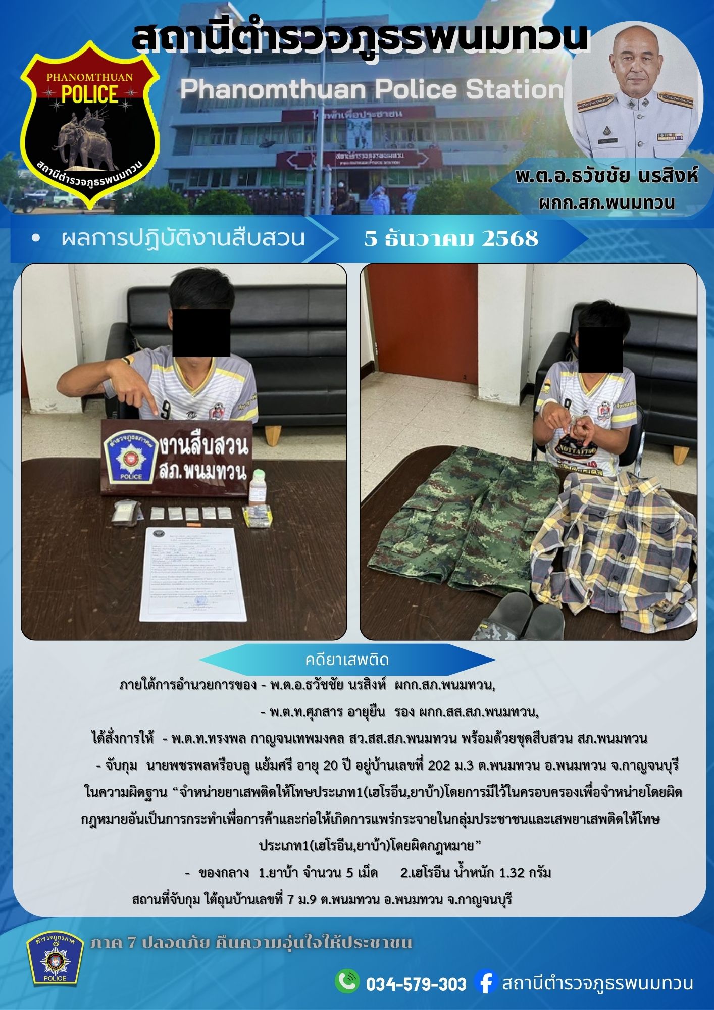 จับกุมผู้ต้องหาคดียาเสพติด 🔺สภ.พนมทวน ภ.จว.กาญจนบุรี – ผลการปฏิบัติจับกุมผู้ต้องหาคดียาเสพติด🔺