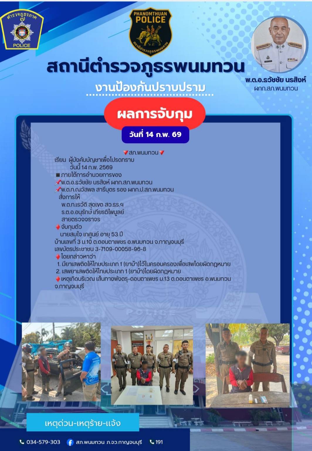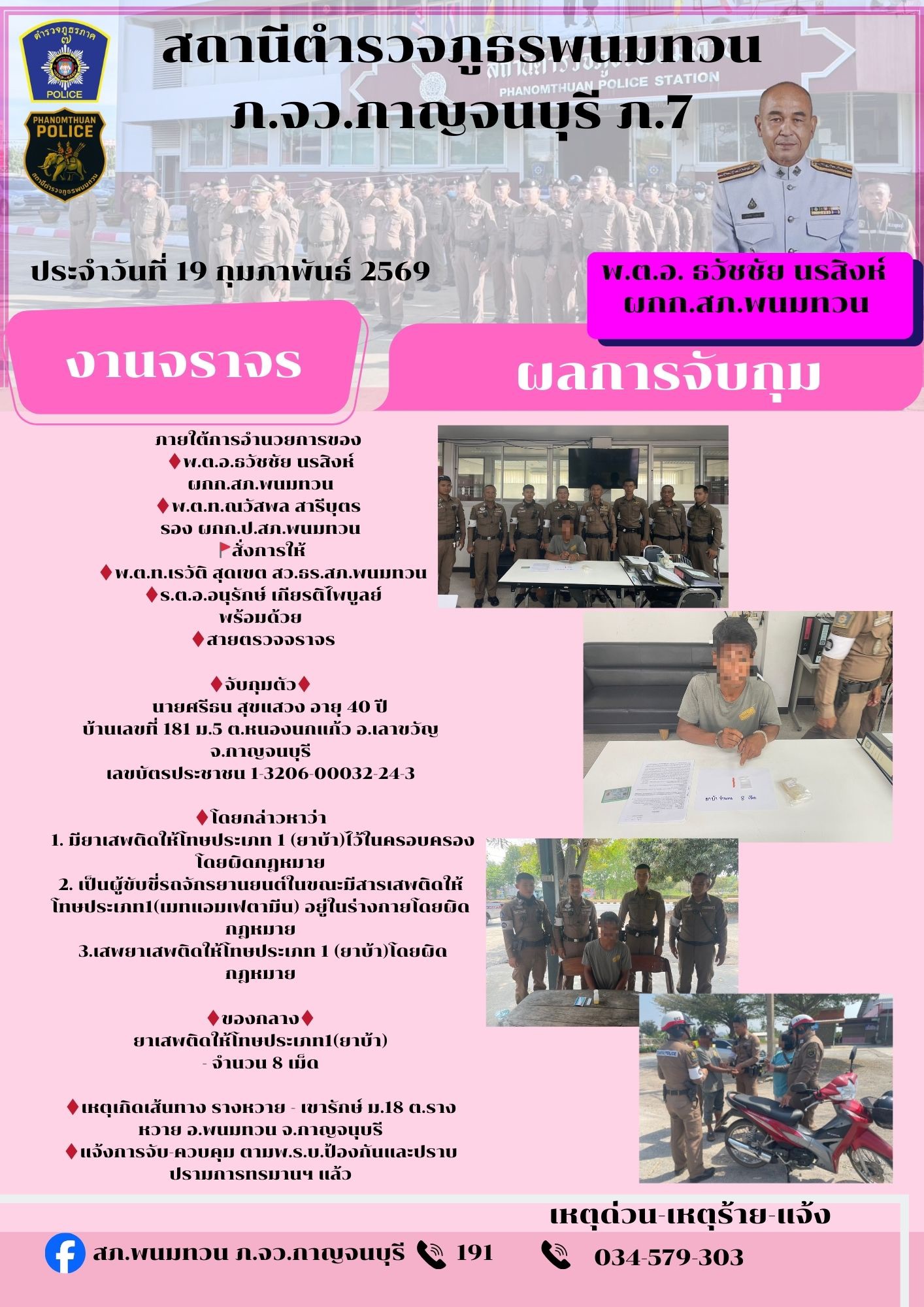 สายตรวจจราจรจับกุมข้อหายาเสพติด ♦️สภ.พนมทวน วันนี้ 19 ก.พ. 2569 ภายใต้การอำนวยการของ ♦️พ.ต.อ.ธวัชชัย